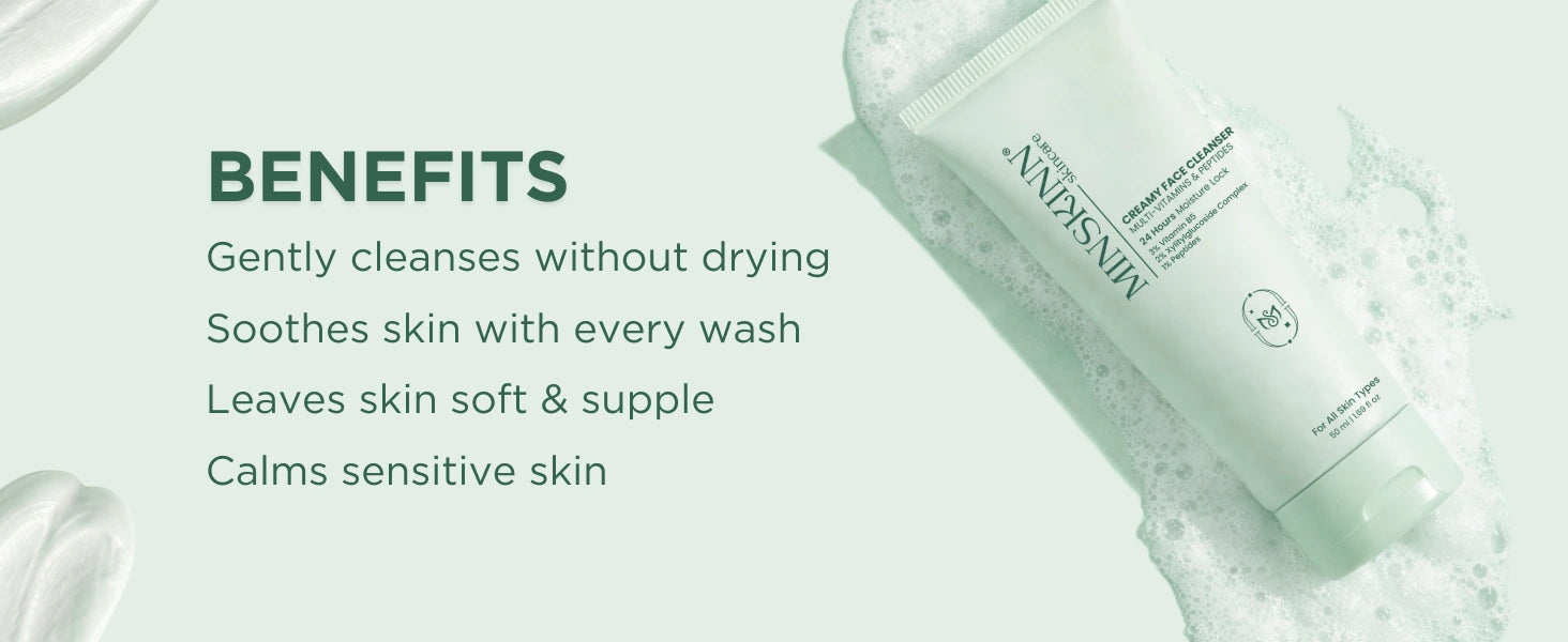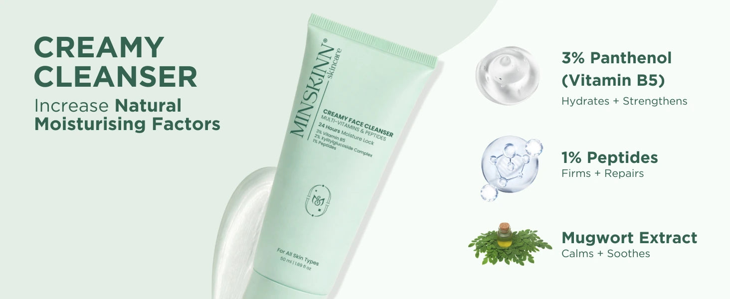 Meet your new everyday essential — Multivitamin Creamy Cleanser a gentle hydrating cleanser crafted with K-Beauty–inspired technology that focuses on skin barrier repair, glass-skin hydration, and soothing botanicals. This sulfate-free cleanser is enriched with 3% Panthenol (Vitamin B5), 0.5% Niacinamide, 0.5% Sodium Hyaluronate, 1% Peptides, and 0.3% Vitamin C for a complete, skin-nourishing cleanse. A skin-friendly surfactant blend of Sodium Cocoyl Isethionate and Decyl Glucoside creates a soft, cushiony lather that removes dirt, sunscreen and excess oil without stripping. The advanced Xylitylglucoside moisture complex, inspired by Korean hydration science, delivers long-lasting moisture — making it the ideal hydrating face wash for dry skin. Infused with Mugwort (Artemisia) extract, a hero K-Beauty ingredient known for calming irritation, redness and acne-prone skin, this cleanser brings soothing comfort to sensitive skin. Niacinamide brightens and balances, while Vitamin C and Vitamin E deliver antioxidant protection for a glowing, even-toned complexion. This nourishing blend makes it not just a cleanser, but a brightening vitamin C face wash, niacinamide cleanser, K-Beauty hydrating cleanser, and mugwort cleanser — all in one.